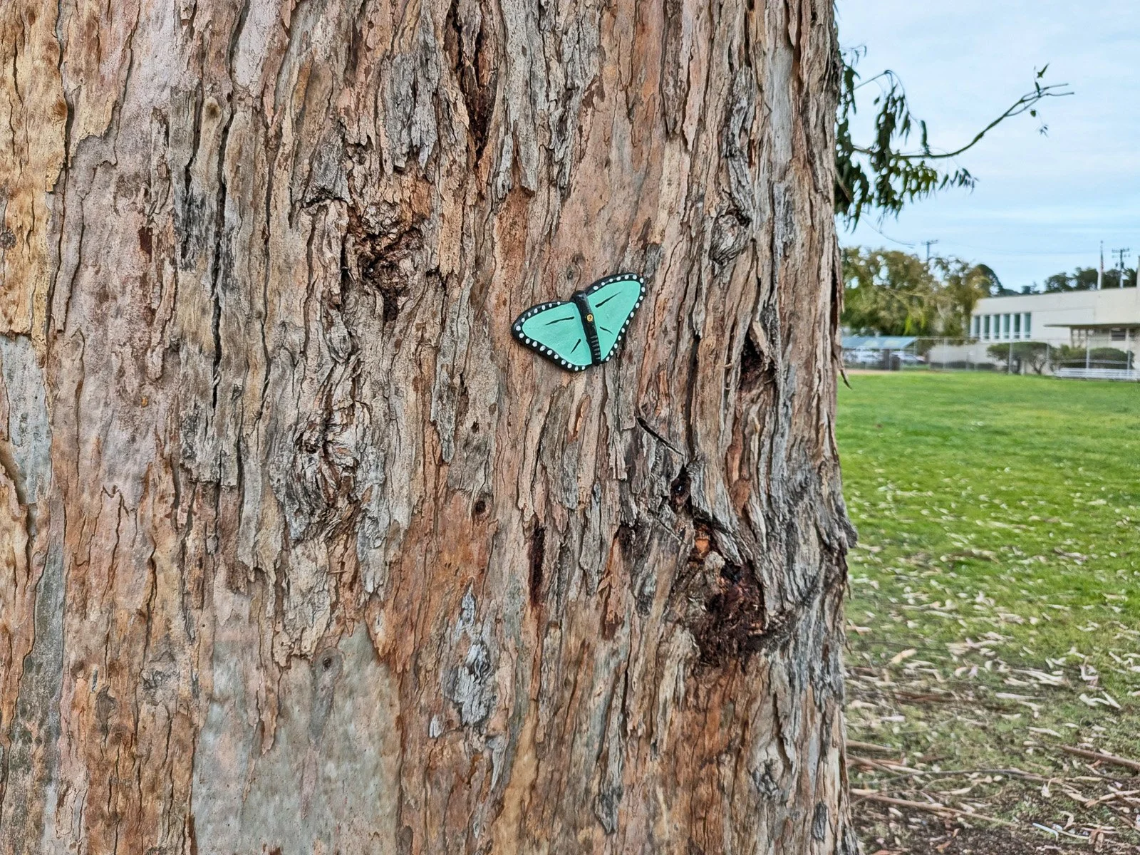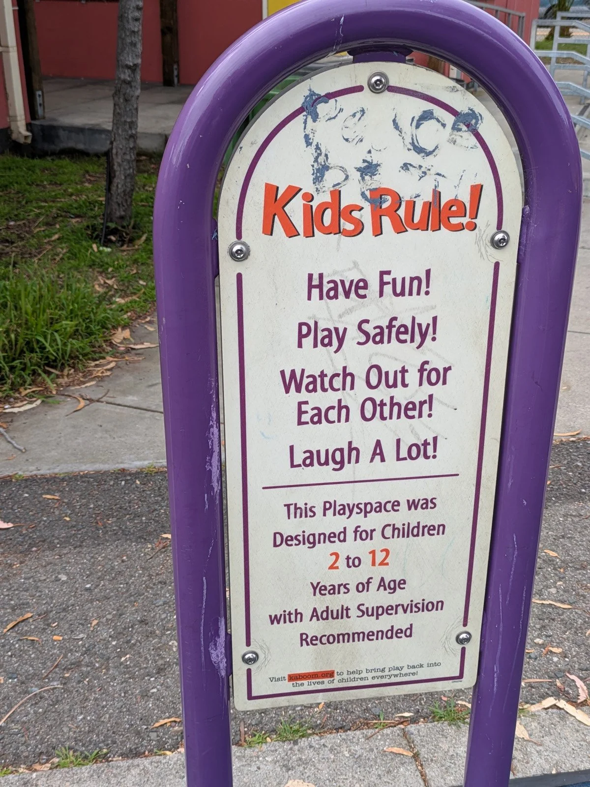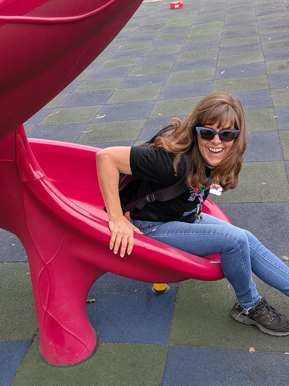 It’s been years since we were last in this park and it was sadly lacking in ceramic butterflies. Fortunately, we brought several. Then we played on all the goodies there. Melissa did the slide while Veronica and I tried out the swings. The signs say kids 2-12 but that didn’t stop us. Now we have big plans. The huge stump there where we put the red butterfly calls out for a set of fairy doors and windows. We’re coming back to create a whole fairy condo.