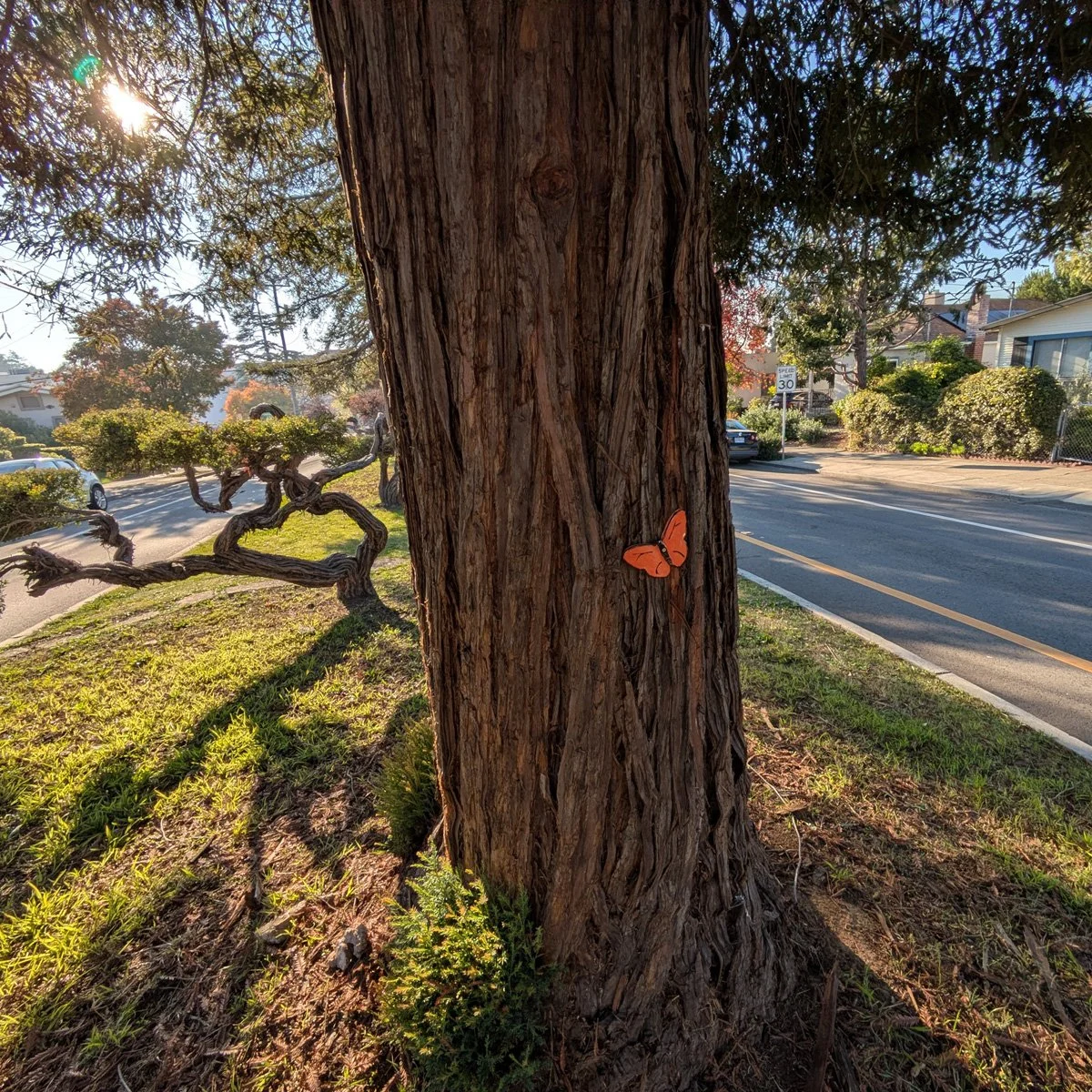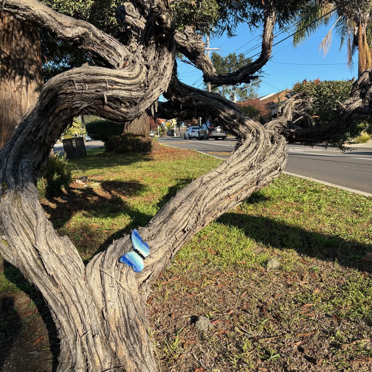 We’ve had a very fun and fairy filled end of the year and now I’m ready to begin posting again. First off, we visited the trees along the median of upper High Street in Oakland. Many butterflies were set out for all to enjoy. Plus we got a chance to decorate a little cactus creature there. And we admired a magnificent multi-branched tree in someone’s yard. Good times!!